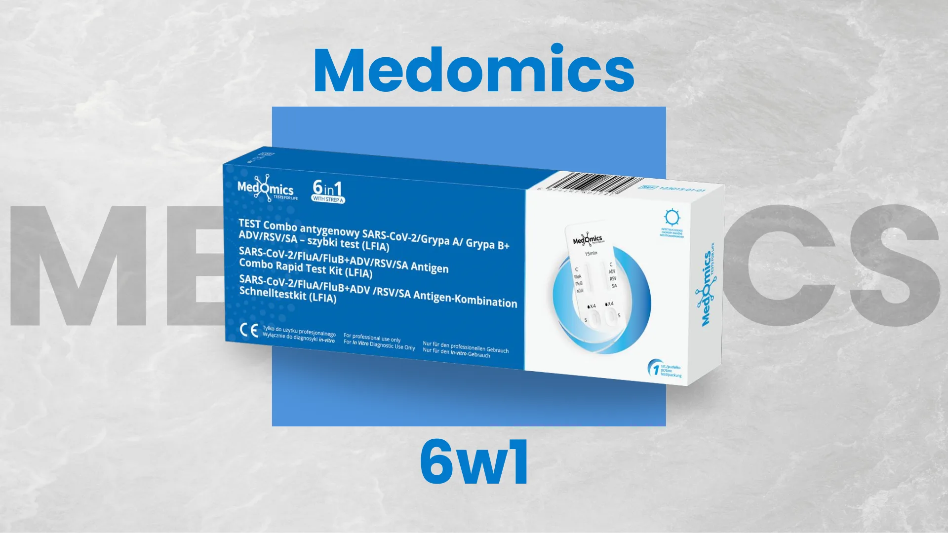 Test Medomics COMBO 5w1 to innowacyjne rozwiązanie diagnostyczne, które umożliwia szybkie wykrycie aż pięciu popularnych wirusów oddechowych z jednej próbki wymazu z nosa. Dzięki technologii testu lateral flow (LFIA), wynik otrzymujesz już po 15 minutach, bez konieczności wykonywania badań laboratoryjnych.
